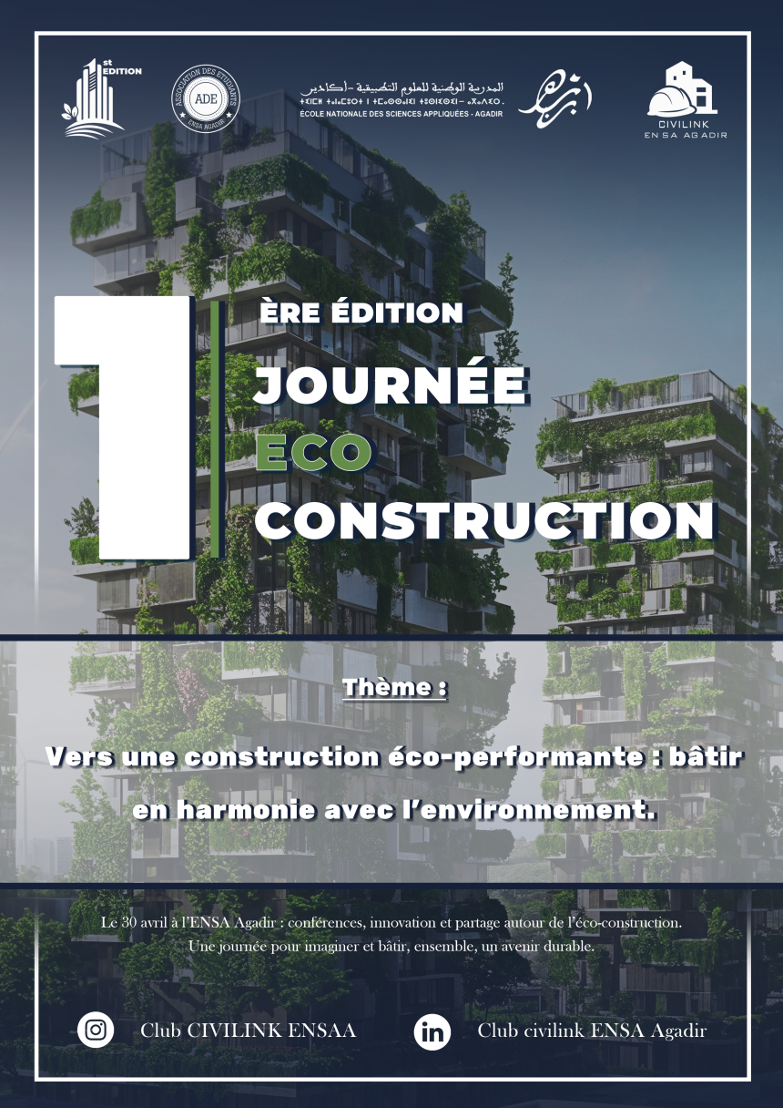 يعلن نادي Civilink التابع للمدرسة الوطنية للعلوم التطبيقية بأكادير (ENSA Agadir) عن تنظيم النسخة الأولى من يوم البناء البيئي، وذلك يوم 30 أبريل 2026 داخل حرم المدرسة، تحت شعار:« نحو بناء بيئي عالي الأداء: