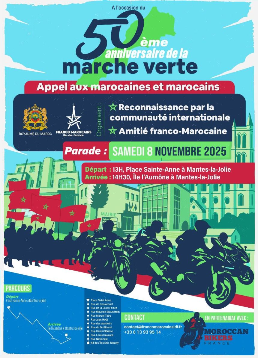 تستعد الجالية المغربية المقيمة بفرنسا لتنظيم احتفال وطني كبير بمناسبة الذكرى الخمسين للمسيرة الخضراء المظفرة، وذلك يوم السبت 8 نونبر 2025 بمدينة مانت لا جولي، في مبادرة تجسد روح الوطنية والاعتزاز بالانتماء، وتؤكد في الوقت ذاته عمق الصداقة المغربية الفرنسية.
