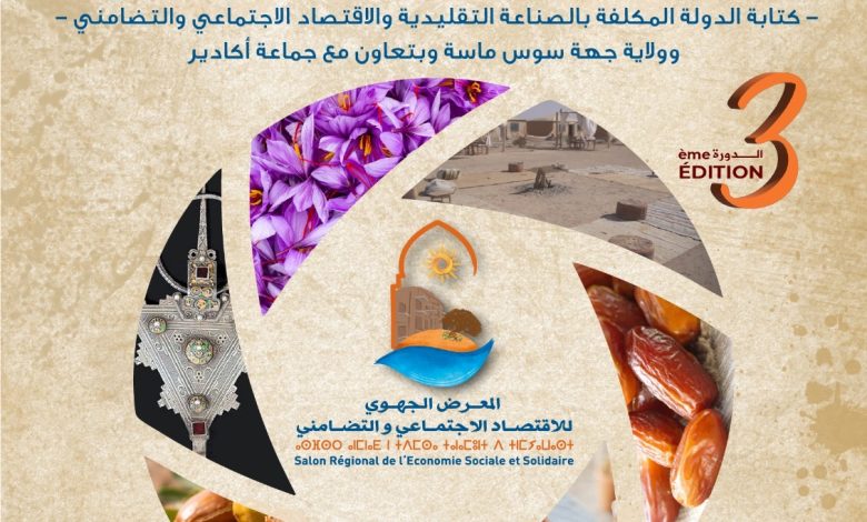 تحت الرعاية السامية لصاحب الجلالة الملك محمد السادس نصره الله وأيده، تنظم جهة سوس ماسة، بشراكة مع وزارة السياحة والصناعة التقليدية والإقتصاد الإجتماعي والتضامني – كتابة الدولة المكلفة بالصناعة التقليدية والإقتصاد الإجتماعي والتضامني – وولاية الجهة، الدورة الثالثة للمعرض الجهوي للإقتصاد الإجتماعي والتضامني، وذلك خلال الفترة الممتدة من 26 يناير إلى 01 فبراير 2026، بفضاء المعارض المحاذي للمركز الاستشفائي الجامعي محمد السادس بأكادير، تحت شعار: «الإقتصاد الإجتماعي والتضامني… خيار استراتيجي من أجل تنمية شاملة».