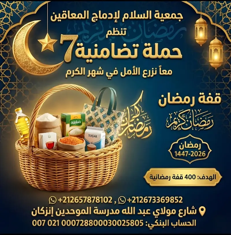في أجواء مليئة بالإيمان ومعاني الرحمة والتكافل، أطلقت جمعية السلام لإدماج المعاقين حملتها التضامنية السنوية لشهر رمضان 1447 هـ / 2026 م، تحت شعار “معًا نزرع الأمل في شهر الكرم”. تهدف هذه المبادرة الإنسانية إلى إدخال الفرحة على الأسر المعوزة والأشخاص ذوي الإعاقة بإنزكان وضواحيها.